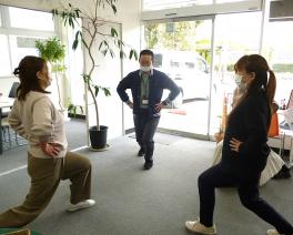 朝礼後の腰痛体操(左) 事務所内の休憩室(右) |